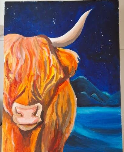 Standing proud beneath a sparkling sky, this rugged bull is the quiet king of the highlands. Guardian of the night bringing the cool, crisp beauty of the wild to your canvas.
