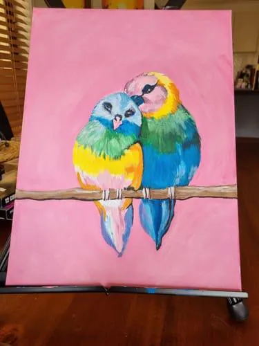 These two colourful lovebirds are giving us the warm and fuzzies. This little pair is perfect for adding a touch of love to your canvas.